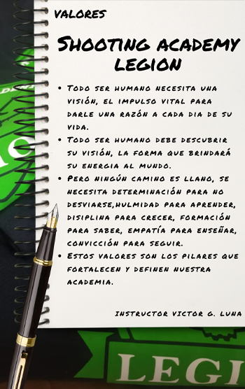 Shooting Academy LEGION, fue creada con el propósito de instruir, capacitar, fortalecer cada necesidad de aquel personal de fuerzas de seguridad, o fuerzas armadas como también a los legítimos usuarios, en técnicas y tácticas totalmente desarrolladas para cada necesidad, tanto en el tiro deportivo, como el tiro defensivo. Teniendo como regla de oro las mediadas de seguridad y las normativas legales.
